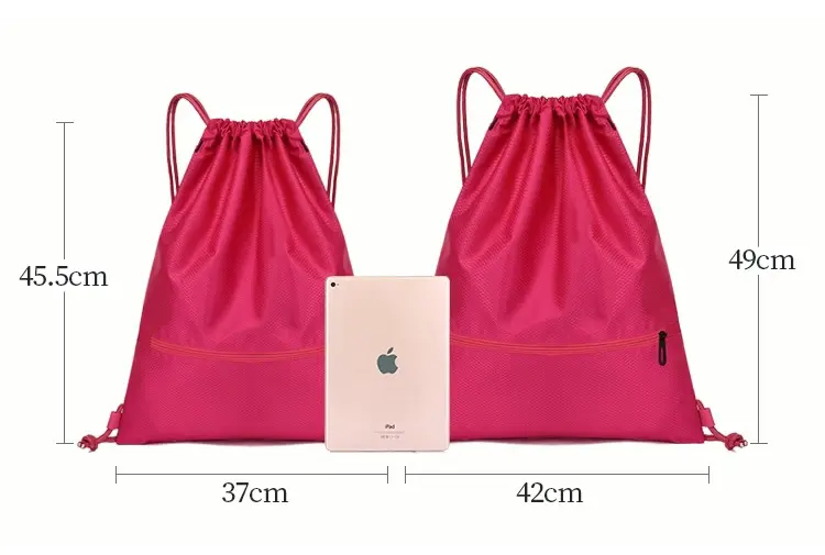 Made of thick polyester material, easy to clean, recyclable, and very durable, strong drawstring shoulder strap design free hands, Large zipper pocket size, can hold a phone, wallet, cup, umbrella or other items. Perfect for all occasions, gym, sports, yoga, dance, travel, carry on, luggage, camping, hiking, teamwork, training and more!